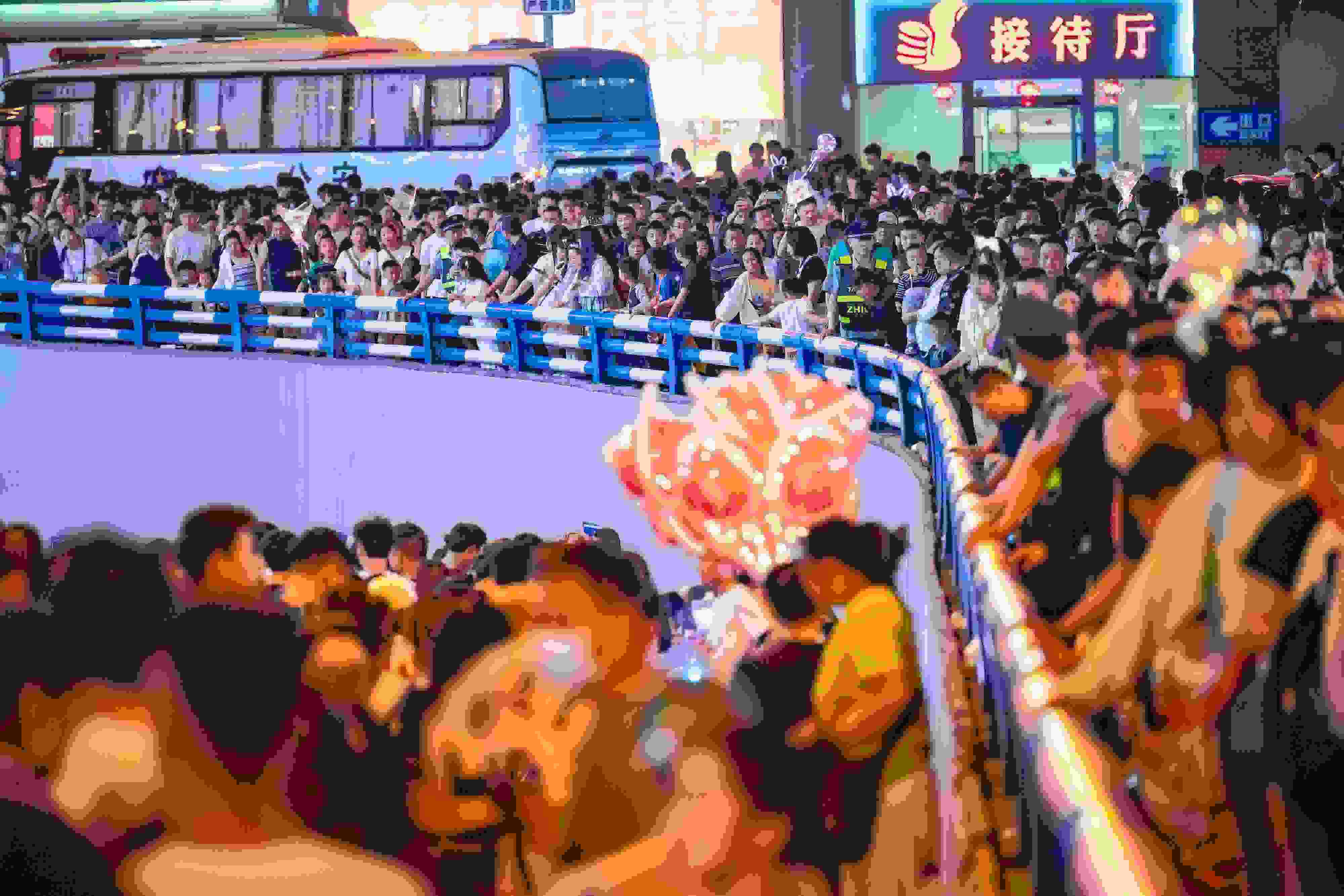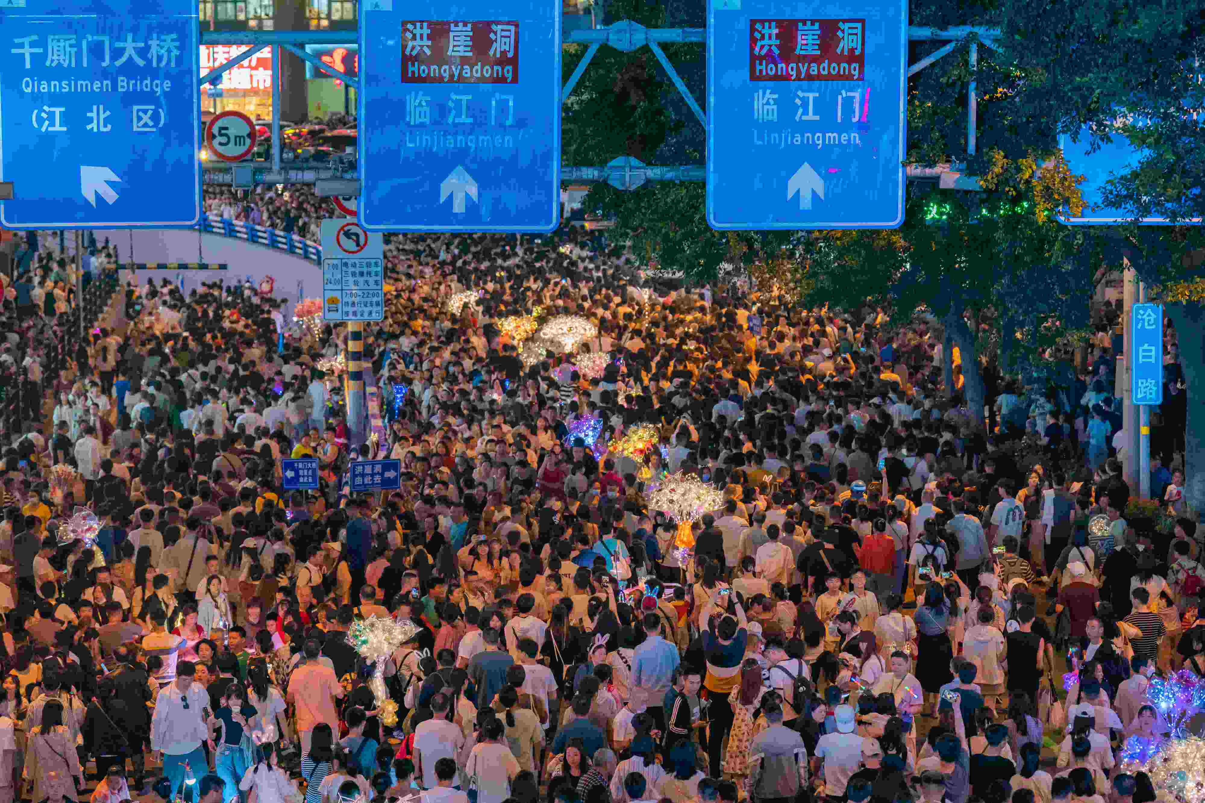2023年4月30日,重慶,洪崖洞等熱門景點迎來游客高峰,千廝門大橋等多條主干道開啟實行交通管制,方便游客出行。 視覺中國