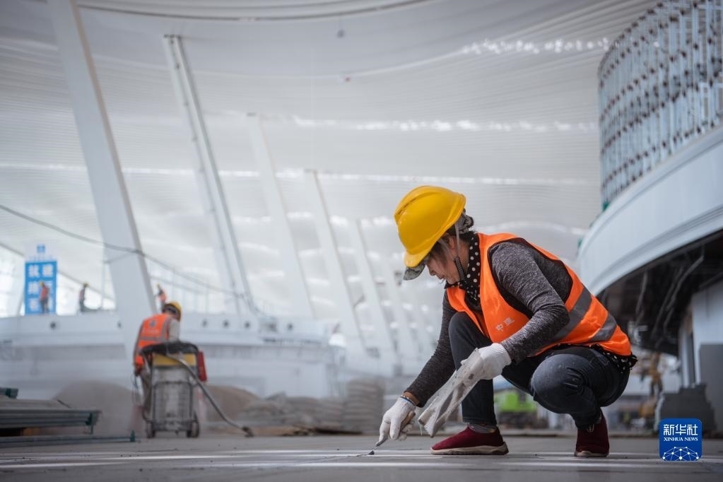 5月1日,在中建三局承建的武漢天河機(jī)場T2航站樓改造工程項目工地,工人在進(jìn)行樓地面施工作業(yè)。