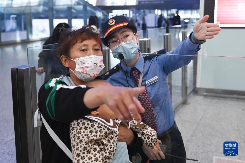 5月1日,在杭州東站候車大廳,客運員陳思悅引導(dǎo)旅客前往檢票口。