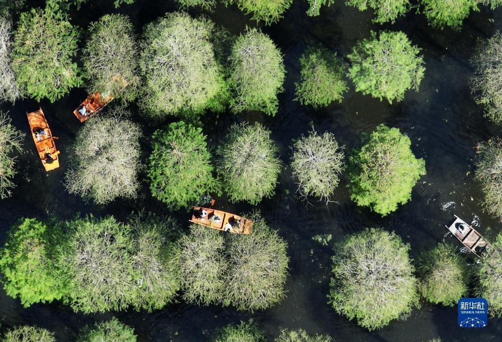 5月1日,游客在江蘇省揚(yáng)州市淥洋湖濕地公園的水上森林乘船游覽(無(wú)人機(jī)照片)。