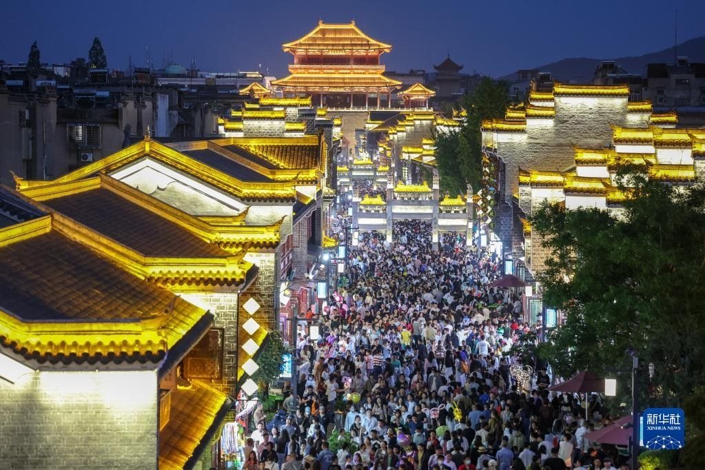 4月30日,游客在湖北襄陽(yáng)古城北街游玩。