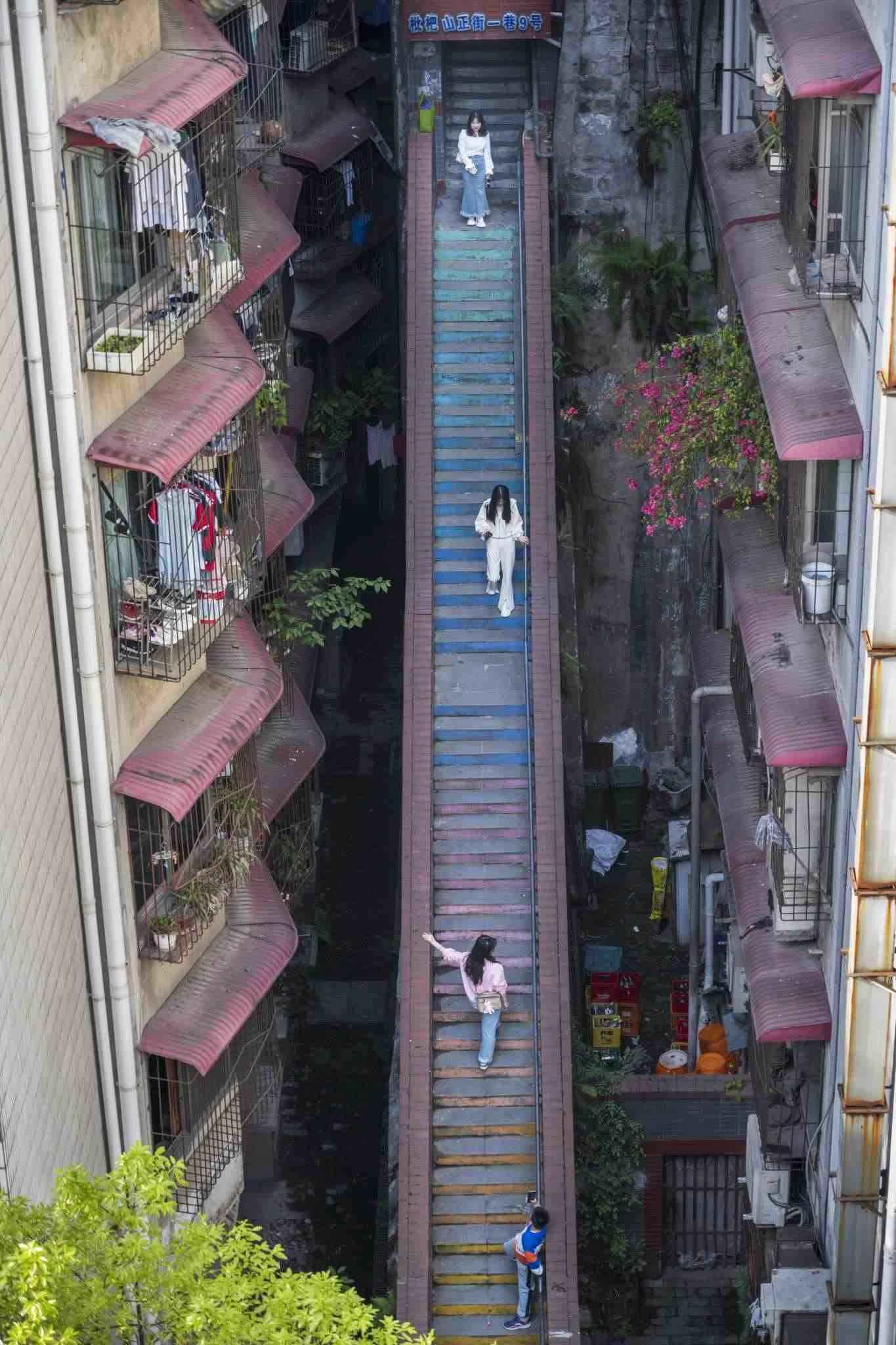“彩虹樓梯”位于重慶渝中區(qū)枇杷山正街的居民樓間,高約20米,共有50多級(jí)階梯,極具山城特色。經(jīng)過(guò)多種顏色涂鴉后,吸引不少市民和攝影愛好者“打卡”。視覺中國(guó)