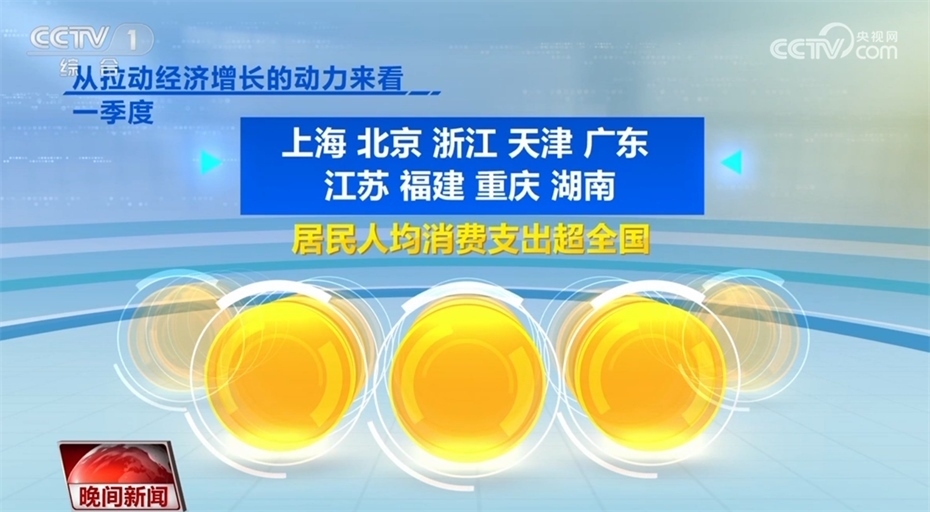 此外,各地經(jīng)濟(jì)發(fā)展也呈現(xiàn)回升向好態(tài)勢。目前,全國31個?。▍^(qū)、市),已經(jīng)全部公布一季度的經(jīng)濟(jì)運行數(shù)據(jù)。從GDP增速來看,31個?。▍^(qū)、市)中有23個省份跑贏全國一季度GDP平均增速4.5%,從地區(qū)GDP總量看,有12個省份超1萬億,廣東超過了3萬億。從拉動經(jīng)濟(jì)增長的動力來看,一季度,上海、北京、浙江、天津、廣東、江蘇、福建、重慶、湖南9省份,居民人均消費支出超全國。