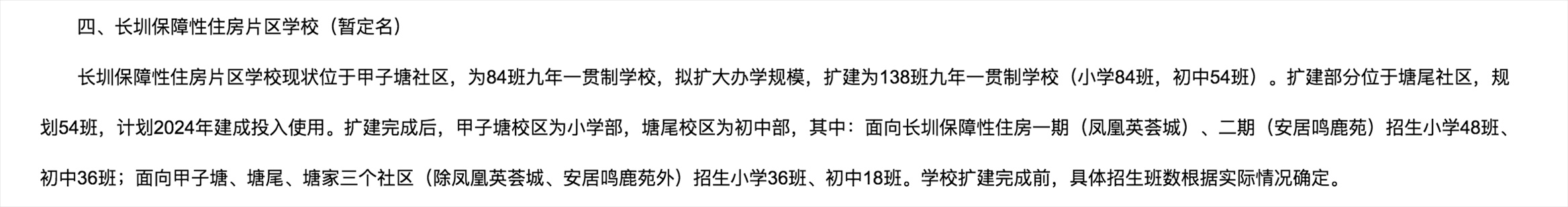 2023年4月10日,深圳市光明區(qū)教育局發(fā)布的《光明區(qū)2023年義務教育階段新增公辦學校學區(qū)劃分方案(征求意見稿)》第三條提到,長圳保障房配套學校(暫定名)學位在保障光明區(qū)長圳保障性住房(鳳凰英薈城、安居鳴鹿苑)小區(qū)住戶子女需求外,剩余學位面向全區(qū)招生。