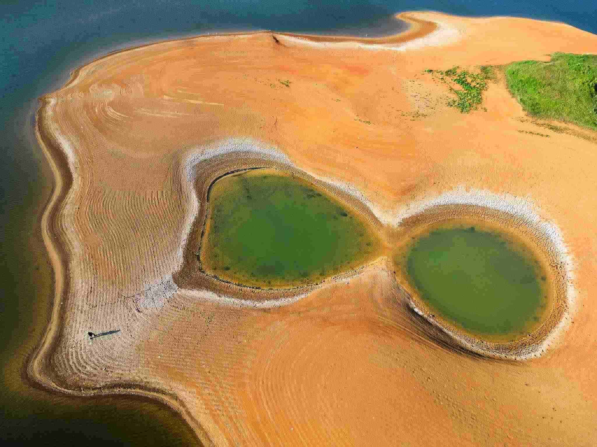 2023年5月2日,貴陽(yáng),紅楓湖水位線下降,湖底大面積裸露,猶如水上丹霞。