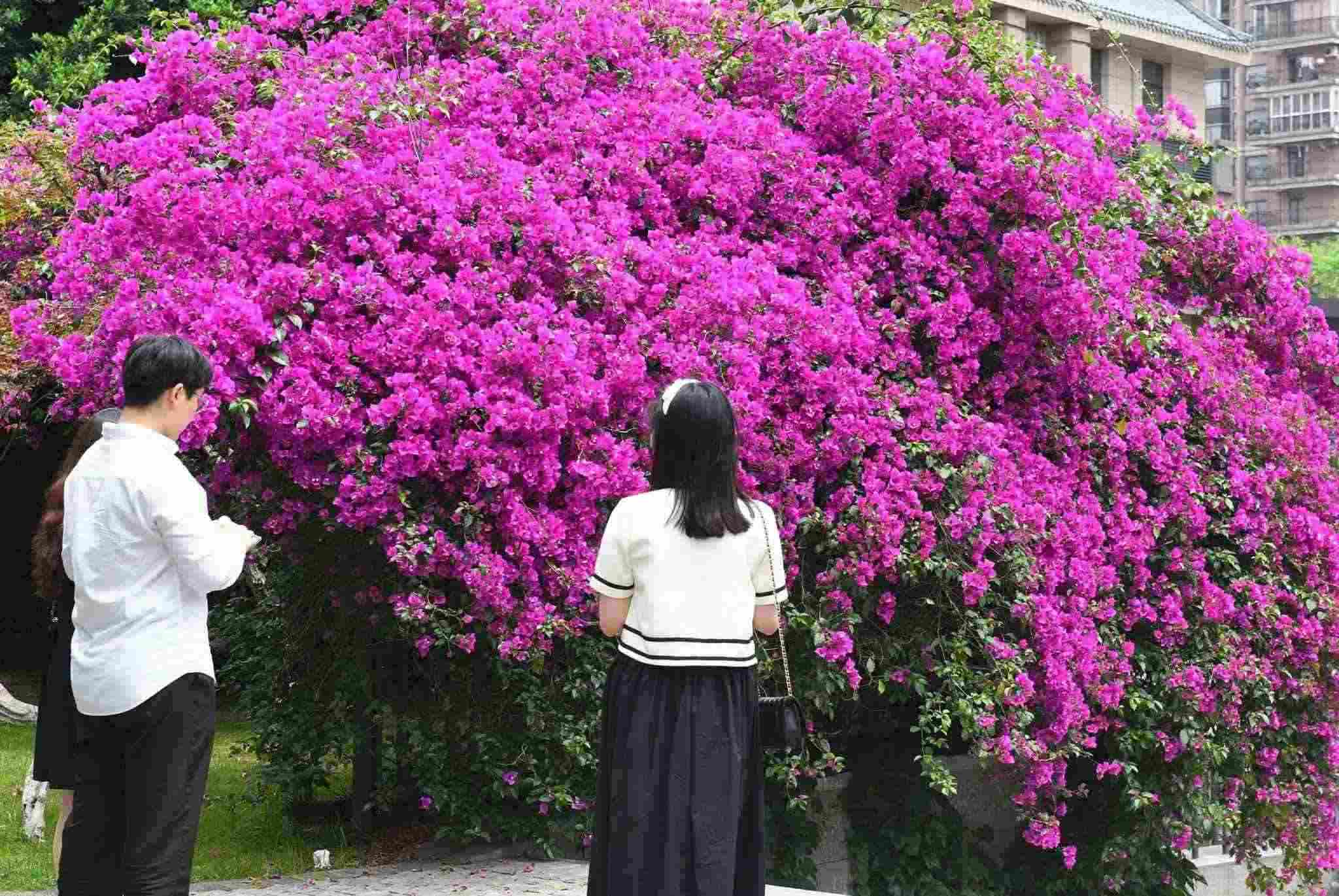 2023年5月5日,重慶,渝中區(qū)上清寺一建筑被盛開的三角梅層層環(huán)繞,仿佛穿上了一件“花衣”。視覺中國(guó)