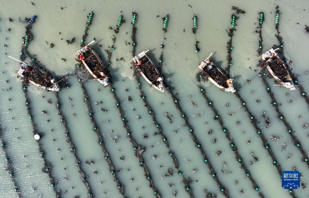 5月8日,在山東省榮成市愛倫灣海域海帶養(yǎng)殖區(qū),漁民采收海帶(無人機照片)。