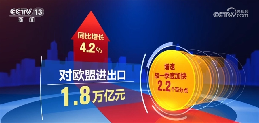 同期,東盟繼續(xù)為我國第一大貿(mào)易伙伴,對東盟進(jìn)出口2.09萬億元,同比增長13.9%,占我國外貿(mào)總值的15.7%;對歐盟進(jìn)出口1.8萬億元,同比增長4.2%,增速較一季度加快2.2個百分點(diǎn)。