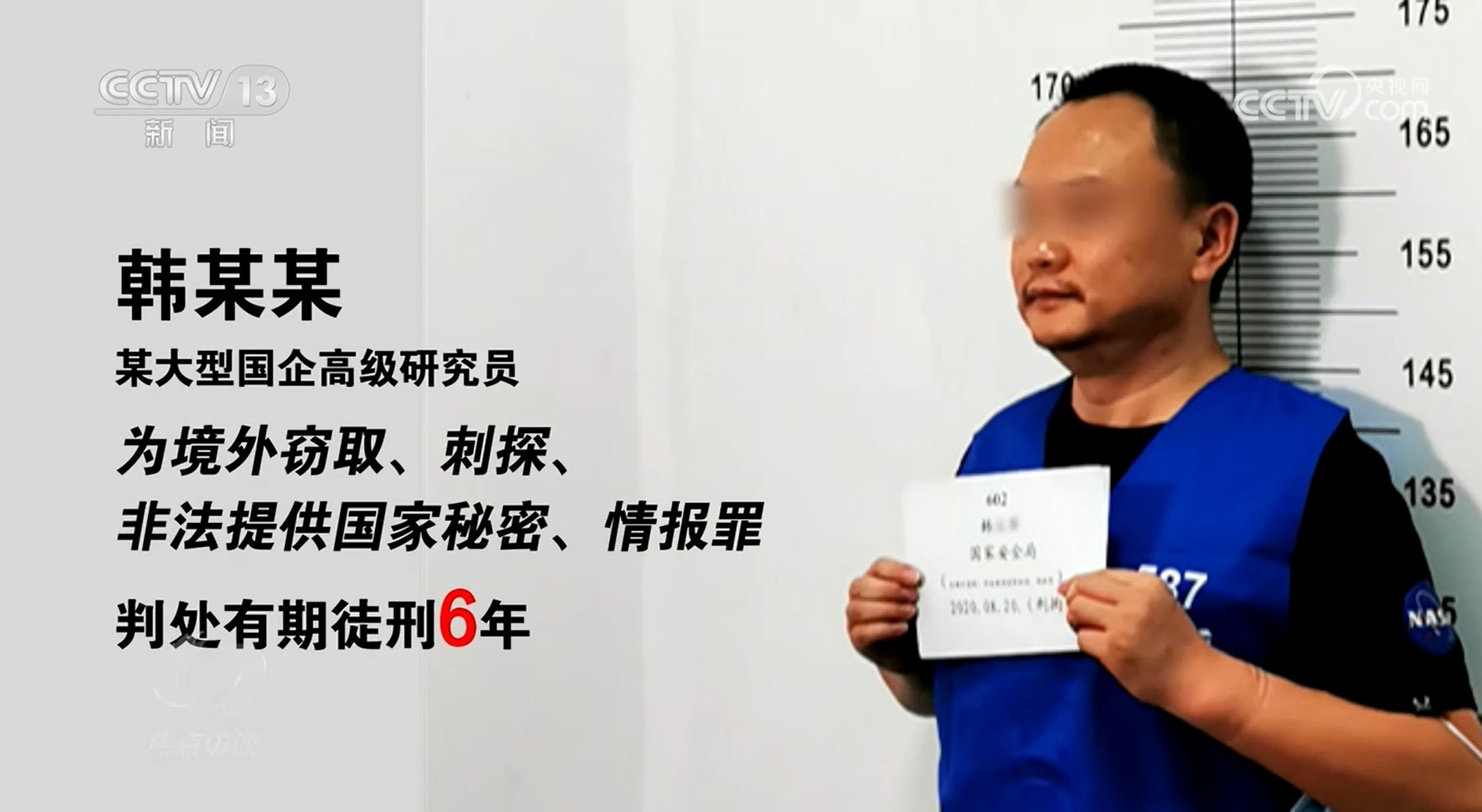 韓某某,我國某大型國企高級研究員,因?yàn)榫惩飧`取、刺探、非法提供國家秘密、情報(bào)罪,被判處有期徒刑6年。