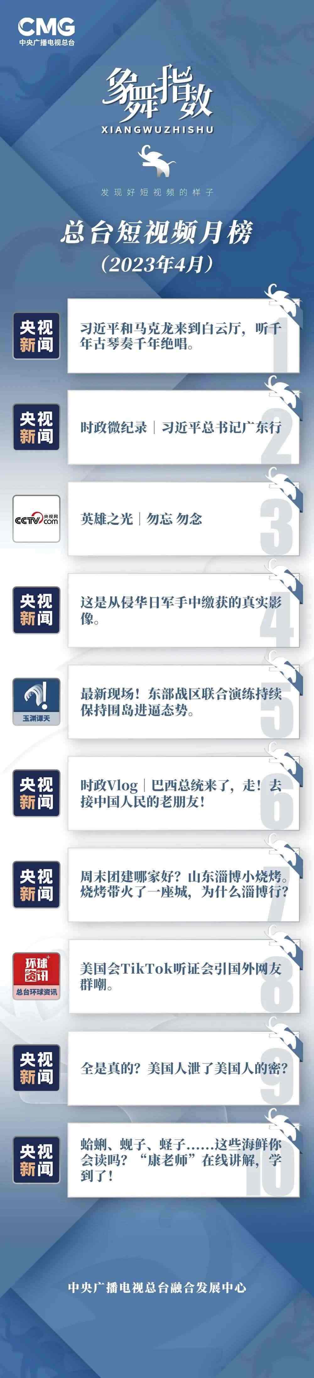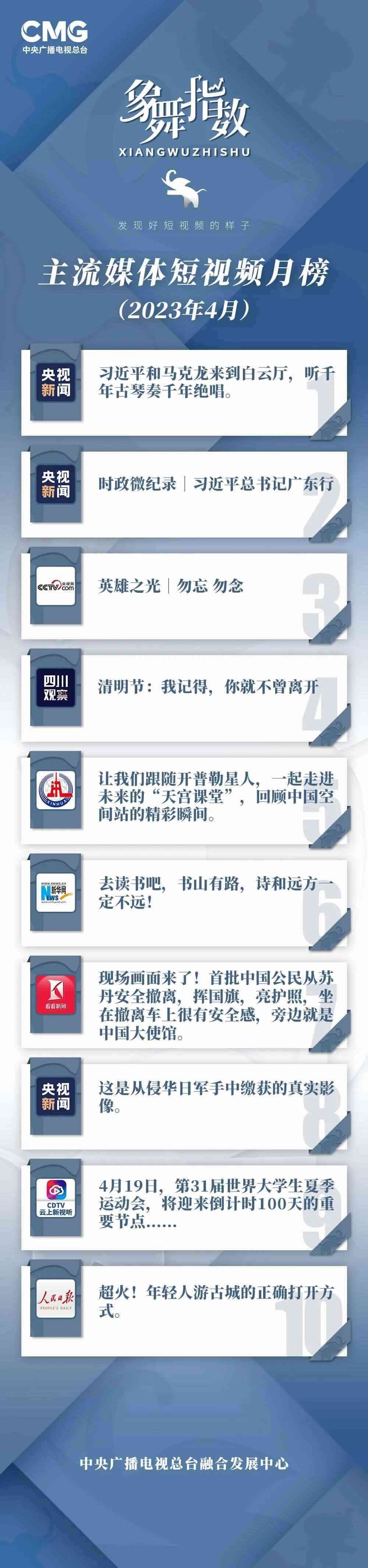 中央廣播電視總臺(tái)“象舞指數(shù)”評(píng)議品牌,推出主流媒體短視頻月榜、總臺(tái)短視頻月榜。在2023年4月,這些內(nèi)容引發(fā)大眾關(guān)注: