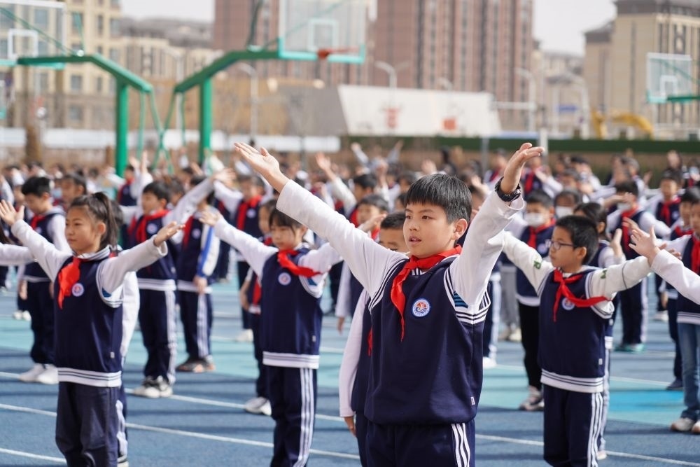 雄安新區(qū)容西片區(qū)云溪小學(xué)的學(xué)生在操場(chǎng)上做操(2023年3月23日攝)。新華社記者 牟宇 攝