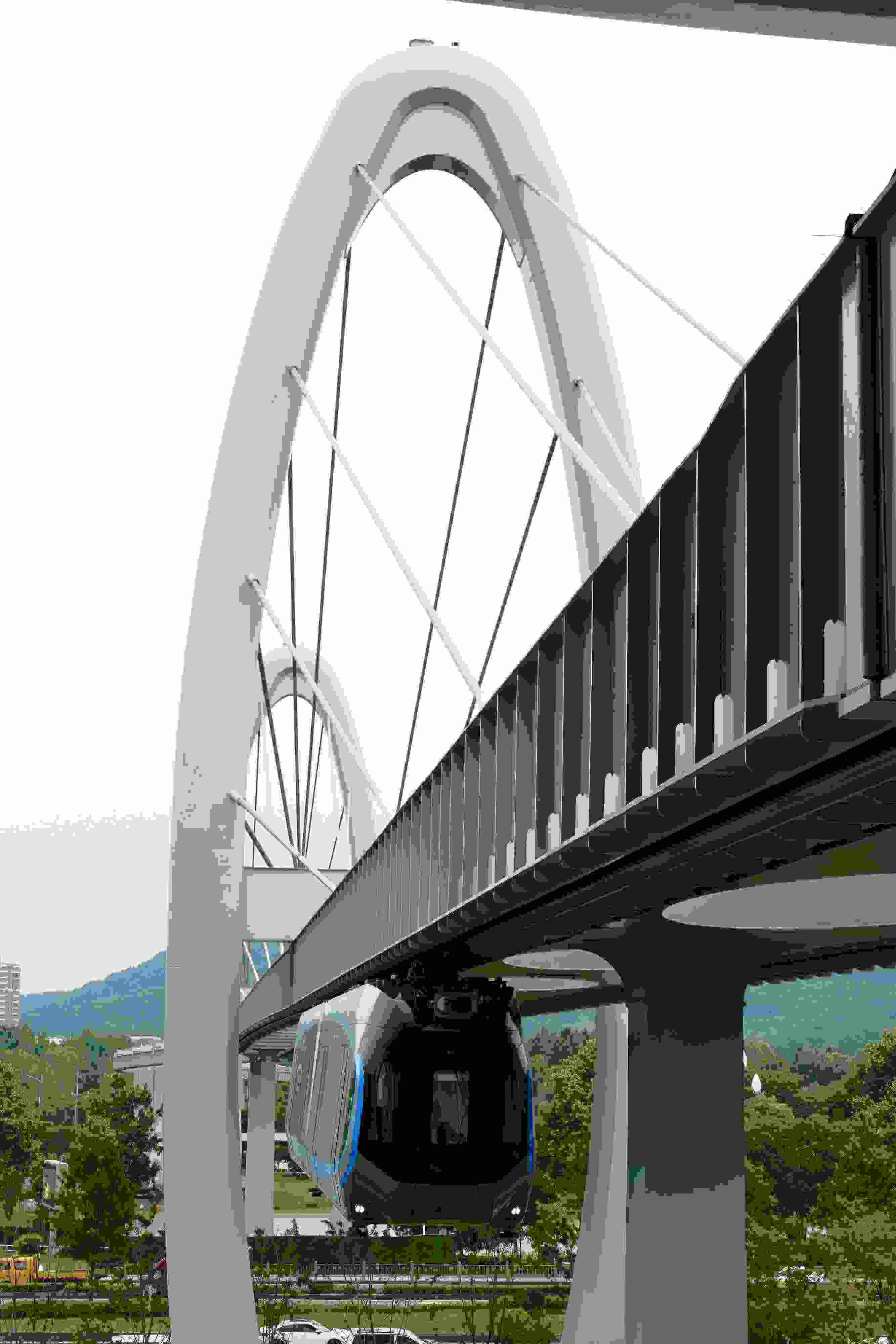 2023年5月11日,武漢,光谷空軌旅游線項(xiàng)目“光谷光子號(hào)”空中軌道列車在東湖高新區(qū)試跑。武漢光谷空軌旅游線項(xiàng)目位于武漢市東湖高新區(qū)光谷中央生態(tài)大走廊內(nèi),是生態(tài)大走廊旅游配套基礎(chǔ)設(shè)施之一。其規(guī)劃總長(zhǎng)26.7公里,先行建設(shè)的一期工程長(zhǎng)約10.5公里,設(shè)車站6座。 視覺(jué)中國(guó)