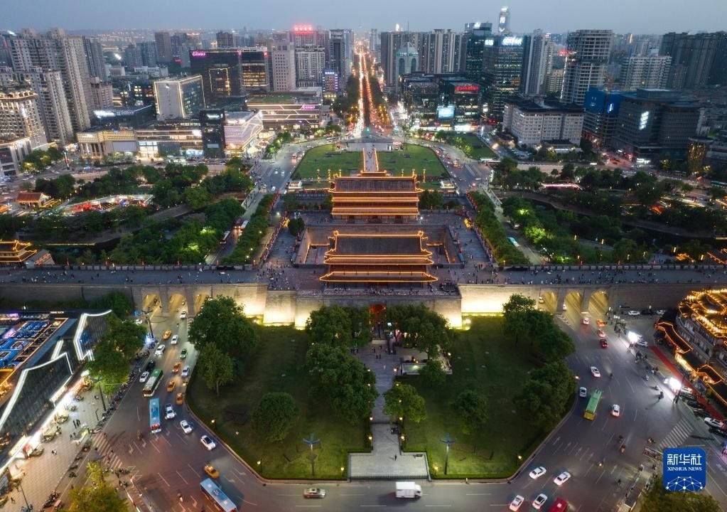 夜色下的西安城墻永寧門(mén)及周邊商圈(4月25日攝,無(wú)人機(jī)照片)。