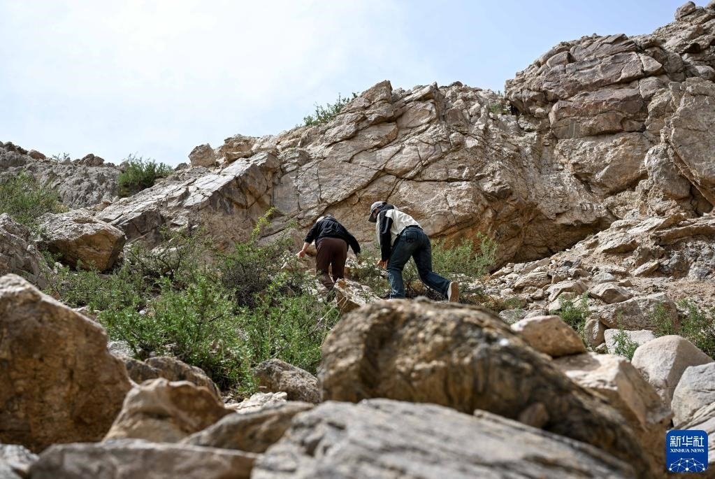 5月13日,駝峰(長(zhǎng)城)文物保護(hù)隊(duì)員許繼龍(右)和烏仁其其格在巡查阿拉善左旗一處石圈遺址。