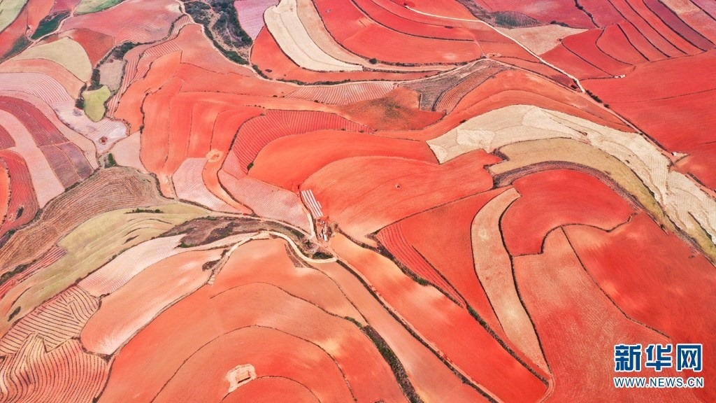 云南省尋甸回族彝族自治縣,連綿不斷的旱梯田遍布山間,遠接天邊,每年4-5月,經(jīng)過村民翻新、平整后的紅褐色土地,從空中俯瞰五彩斑斕、蔚為壯觀。當?shù)卮迕裥燎诟旁诜饰值募t土地上,用勤勞的雙手,繪就一幅幅勞動藝術(shù)畫作。新華網(wǎng)發(fā)(孫文來 攝影報道)