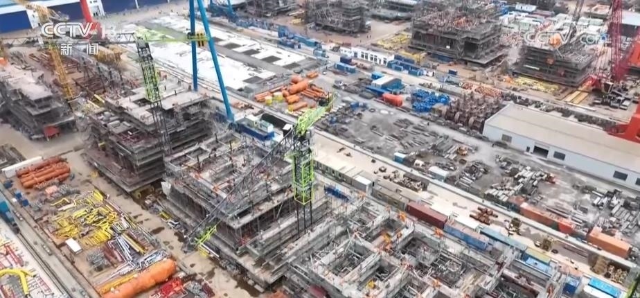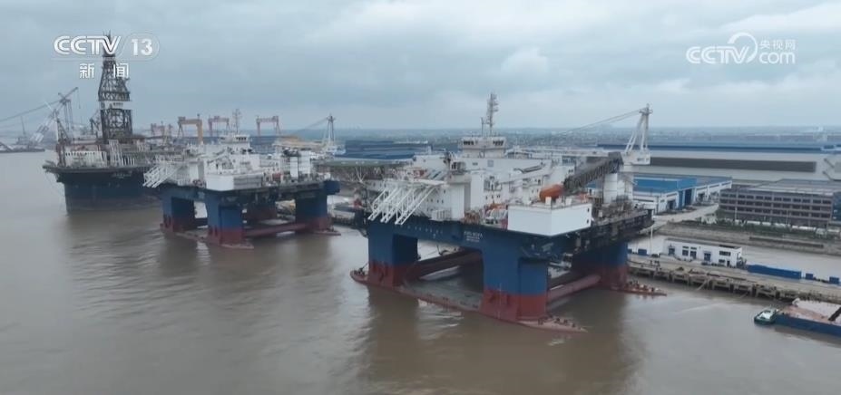 這些大家伙,都是世界技術比較領先的一些海工裝備。通過航拍的鏡頭,給大家展現(xiàn)一下,最遠的是圓筒形超深水鉆探平臺。因為它的外形是獨特的圓筒型設計,所以它的抗風浪性、作業(yè)水深的能力非常得好,技術指標創(chuàng)下多項世界第一。這家企業(yè),一共向國外交付了6艘同類型的產品。
