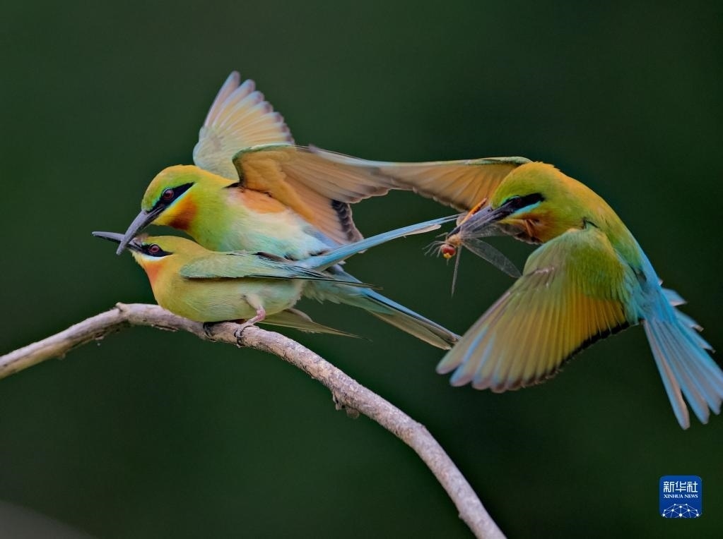 5月20日,兩只栗喉蜂虎在樹枝上玩耍。