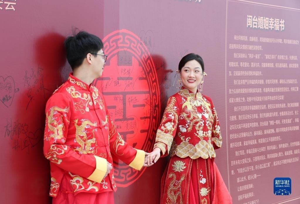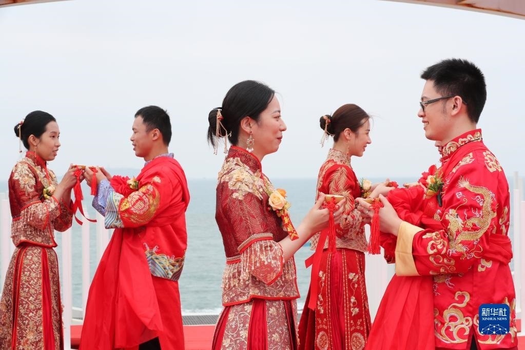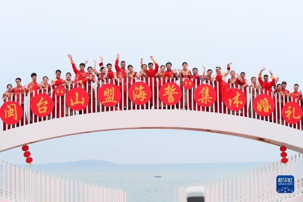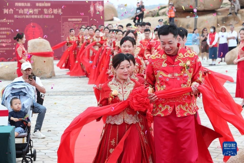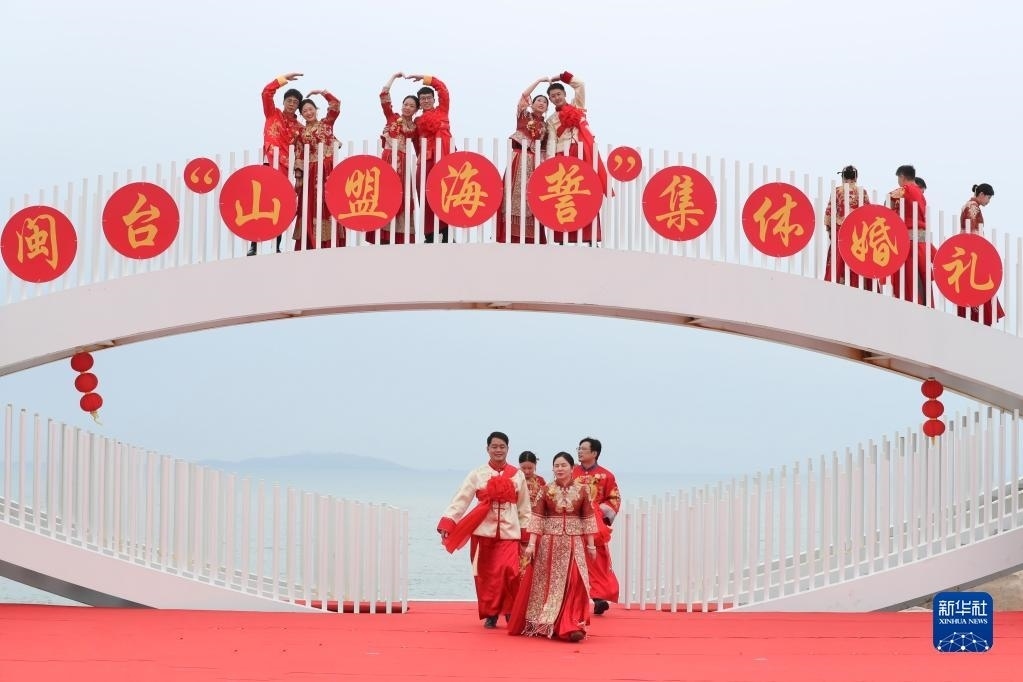 當日,一場以“愛情恒久遠、幸福長相伴”為主題的閩臺“山盟海誓”集體婚禮暨2023年閩臺婚姻家庭交流活動在福建省福州市平潭縣舉辦。21對閩臺新人身穿紅色中式婚服,手牽紅繡球,行跨火盆、踩瓦片、扎繡球和“合茶”、“合巹”、“海誓”等閩臺傳統(tǒng)結(jié)婚禮儀,結(jié)下跨越海峽的姻緣。