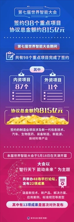 ·第七屆世界智能大會簽約98個(gè)重點(diǎn)項(xiàng)目,協(xié)議總金額約815億元。