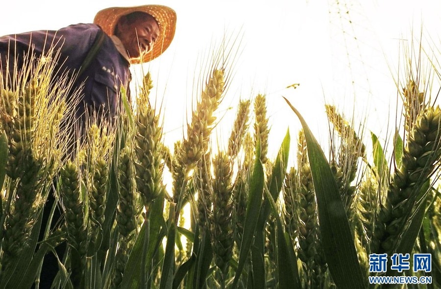 ??夕陽下,麥農(nóng)察看小麥長(zhǎng)勢(shì)。新華網(wǎng) 發(fā)(高新生 攝)??
