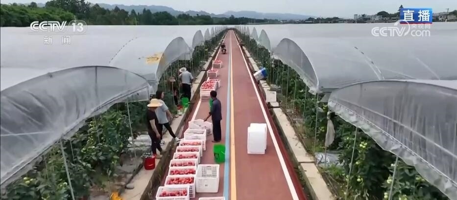 我身后就是一大片番茄種植棚,整齊栽種行距方便管理與采摘,噴灌、滴灌設(shè)備能讓番茄更加水潤(rùn)多汁,而且番茄植株在生長(zhǎng)的過(guò)程中,也形成了果實(shí)漸次成熟的立體梯度,讓整個(gè)采摘季能達(dá)到一個(gè)多月。這一片設(shè)施農(nóng)業(yè),一天產(chǎn)出的番茄總量達(dá)到了兩三萬(wàn)斤,不僅服務(wù)了成渝雙城經(jīng)濟(jì)圈,據(jù)說(shuō)五月份最遠(yuǎn)的一份訂單是供應(yīng)大灣區(qū)的。說(shuō)到設(shè)施農(nóng)業(yè),除了設(shè)施變得更科學(xué)、更智慧之外,現(xiàn)在的訂單農(nóng)業(yè)也在幫助農(nóng)民獲得更準(zhǔn)確的銷售網(wǎng)絡(luò)。