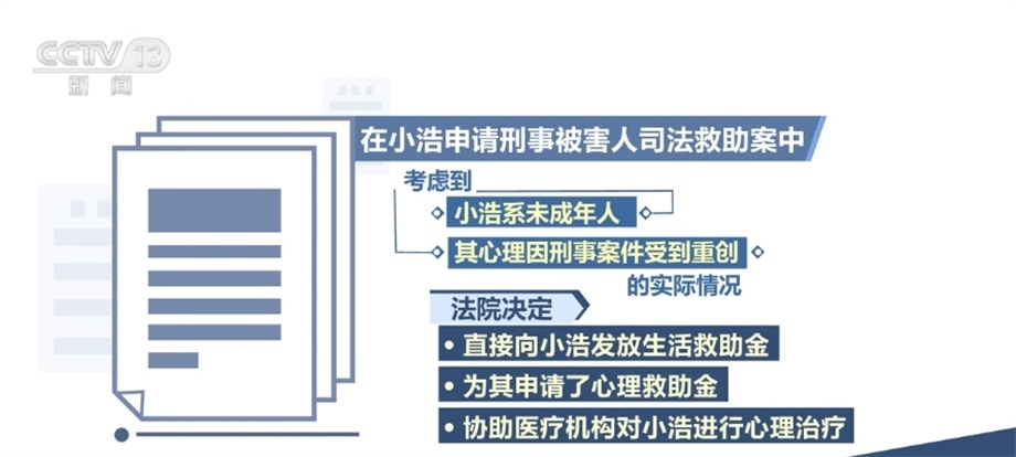 在此次發(fā)布的保護未成年人權益司法救助典型案例中,還涉及針對向未成年人提供專門心理救助金、提供心理危機干預等立體幫扶,進一步延伸司法服務。在小浩申請刑事被害人司法救助案中,小浩的父親被害,其本人亦受到人身傷害,法院作出刑事附帶民事判決,判處被告人死刑,并判決其賠償附帶民事訴訟原告人經濟損失13萬余元。后經調查,被告人無財產可供執(zhí)行。考慮到小浩系未成年人,其心理因刑事案件受到重創(chuàng)的實際情況,法院除決定直接向小浩發(fā)放生活救助金外,還為其申請了心理救助金,協(xié)助醫(yī)療機構對小浩進行心理治療。