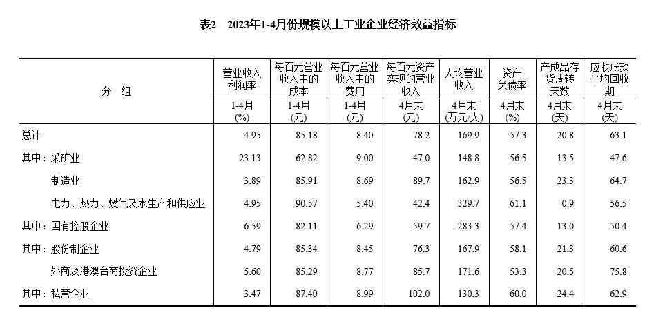 4月末,規(guī)模以上工業(yè)企業(yè)每百元資產(chǎn)實現(xiàn)的營業(yè)收入為78.2元,同比減少5.6元;人均營業(yè)收入為169.9萬元,同比增加6.2萬元;產(chǎn)成品存貨周轉(zhuǎn)天數(shù)為20.8天,同比增加1.3天;應收賬款平均回收期為63.1天,同比增加6.4天。