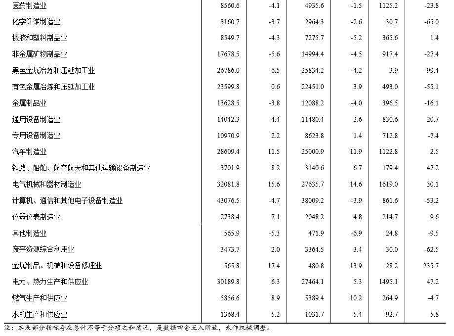 1—4月份,在41個工業(yè)大類行業(yè)中,13個行業(yè)利潤總額同比增長,1個行業(yè)持平,27個行業(yè)下降。主要行業(yè)利潤情況如下:電力、熱力生產(chǎn)和供應業(yè)利潤總額同比增長47.2%,電氣機械和器材制造業(yè)增長30.1%,通用設備制造業(yè)增長20.7%,汽車制造業(yè)增長2.5%,石油和天然氣開采業(yè)下降6.0%,專用設備制造業(yè)下降7.4%,煤炭開采和洗選業(yè)下降14.6%,非金屬礦物制品業(yè)下降27.4%,紡織業(yè)下降30.2%,農(nóng)副食品加工業(yè)下降36.3%,計算機、通信和其他電子設備制造業(yè)下降53.2%,有色金屬冶煉和壓延加工業(yè)下降55.1%,化學原料和化學制品制造業(yè)下降57.3%,石油、煤炭及其他燃料加工業(yè)下降87.9%,黑色金屬冶煉和壓延加工業(yè)下降99.4%。