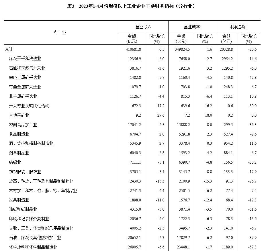 1—4月份,采礦業(yè)實現(xiàn)利潤總額4752.4億元,同比下降12.3%;制造業(yè)實現(xiàn)利潤總額13723.7億元,下降27.0%;電力、熱力、燃氣及水生產(chǎn)和供應業(yè)實現(xiàn)利潤總額1852.7億元,增長34.1%。