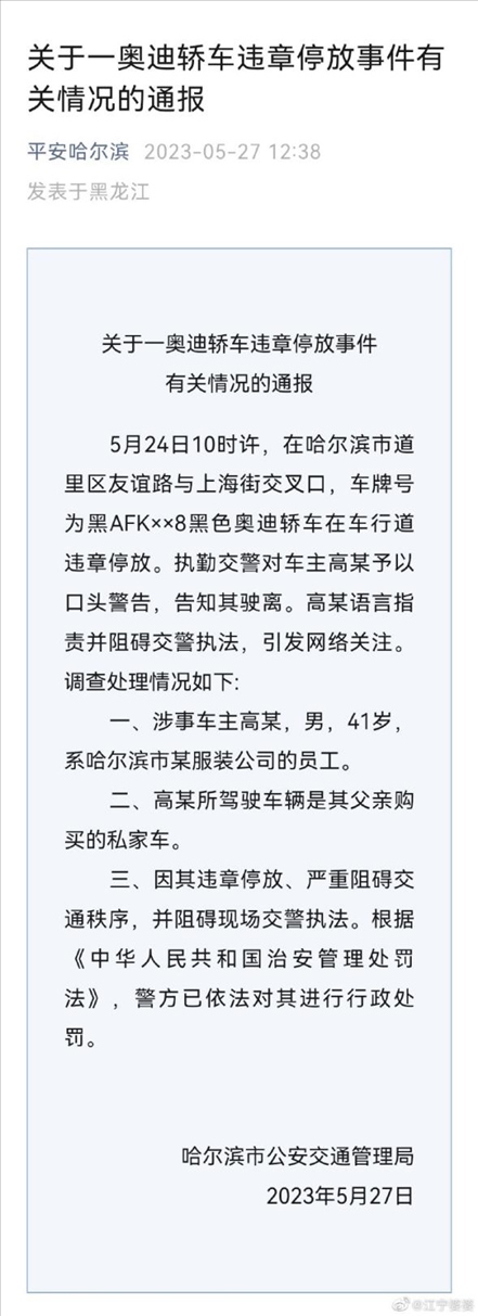 ·哈爾濱警方通報(bào)網(wǎng)傳副市長違停與交警沖突:涉事車主為服裝公司員工。