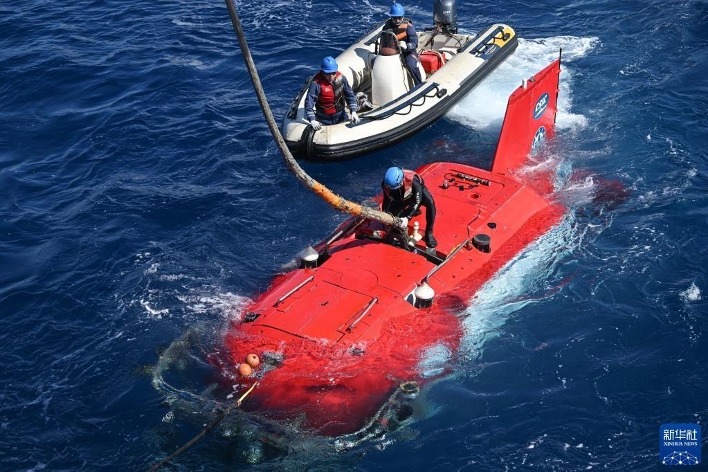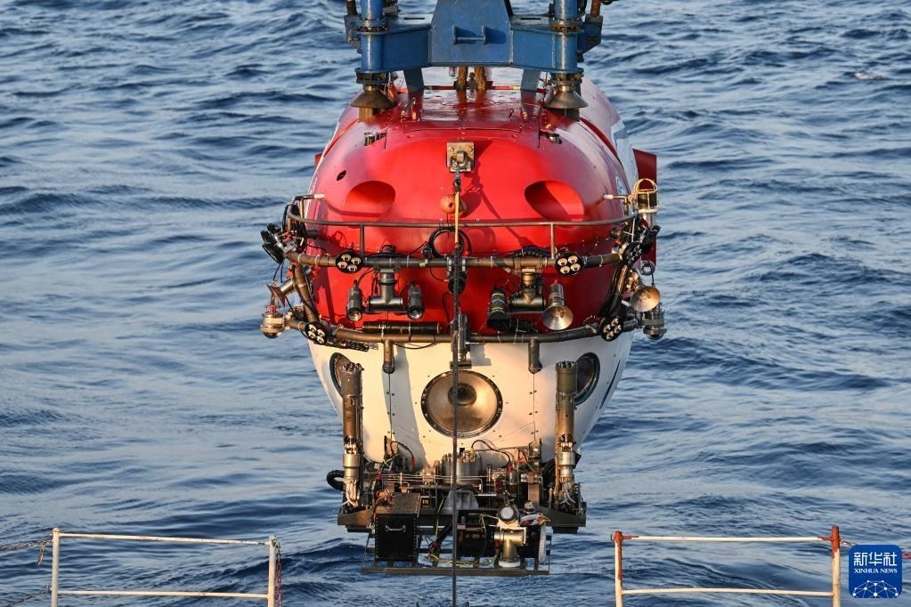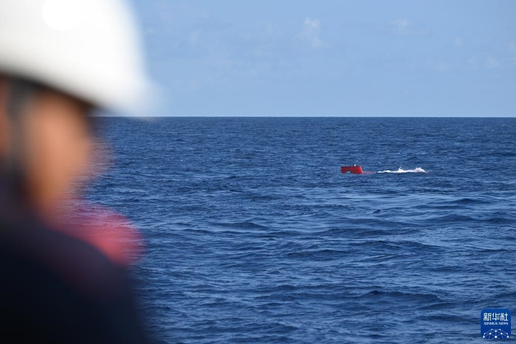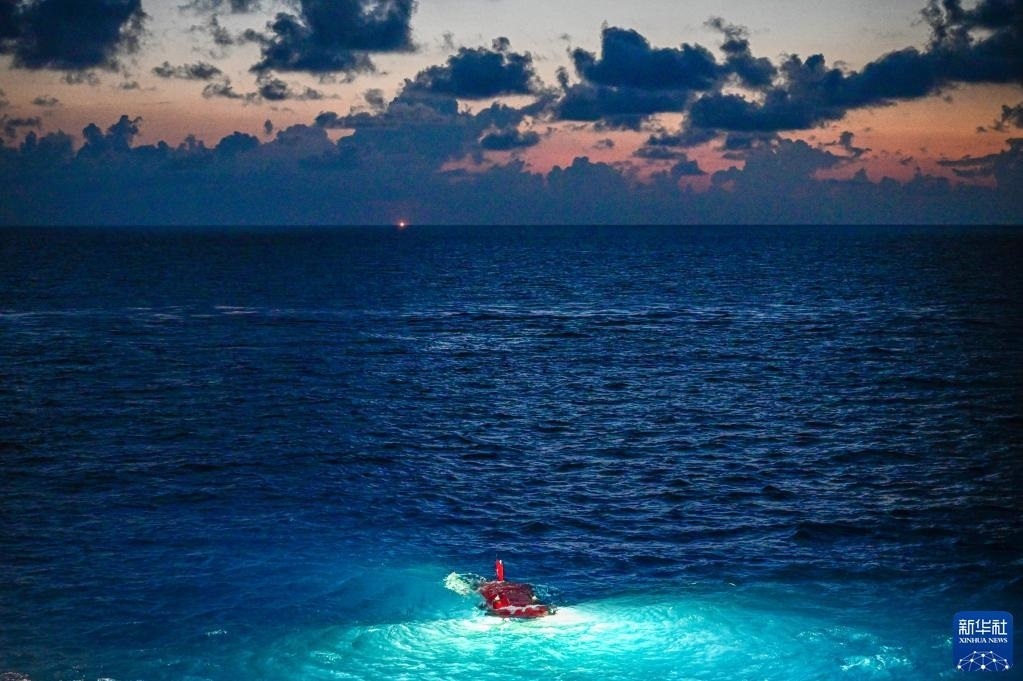 在結(jié)束當(dāng)日的水下調(diào)查后,搭載著考古隊(duì)員的“深海勇士”號(hào)載人潛水器浮出海面(5月27日攝)。   新華社記者 蒲曉旭 攝