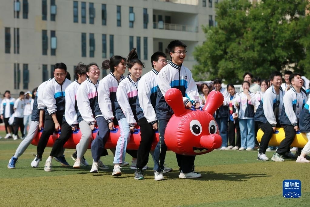 高考臨近,安徽省淮北市第十二中學(xué)組織高三年級(jí)學(xué)生開(kāi)展豐富多彩的集體減壓活動(dòng),讓學(xué)生們?cè)谌の队螒蛑嗅尫艍毫?,以輕松、樂(lè)觀、自信的心態(tài)迎接高考。新華社發(fā)(萬(wàn)善朝 攝)