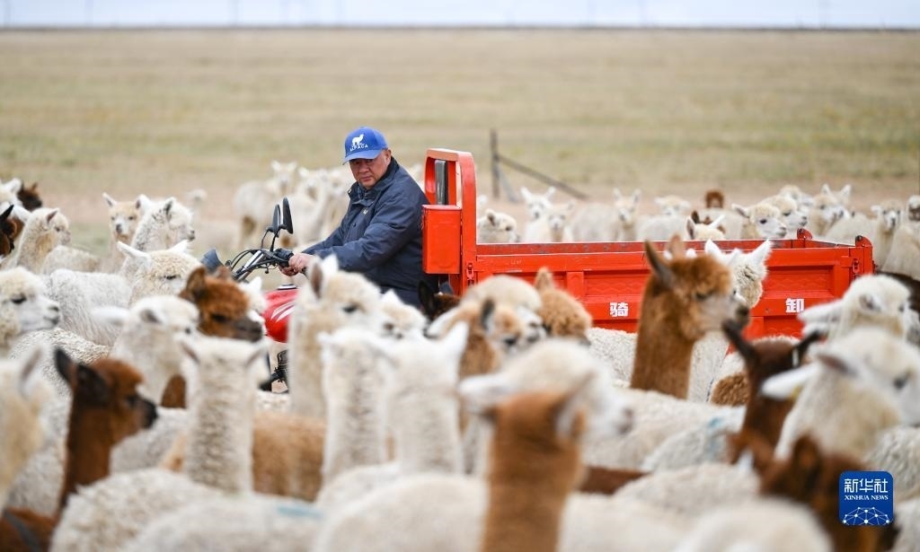 6月1日,巴彥杭蓋嘎查羊駝養(yǎng)殖基地的工作人員在觀察羊駝的飼養(yǎng)情況。