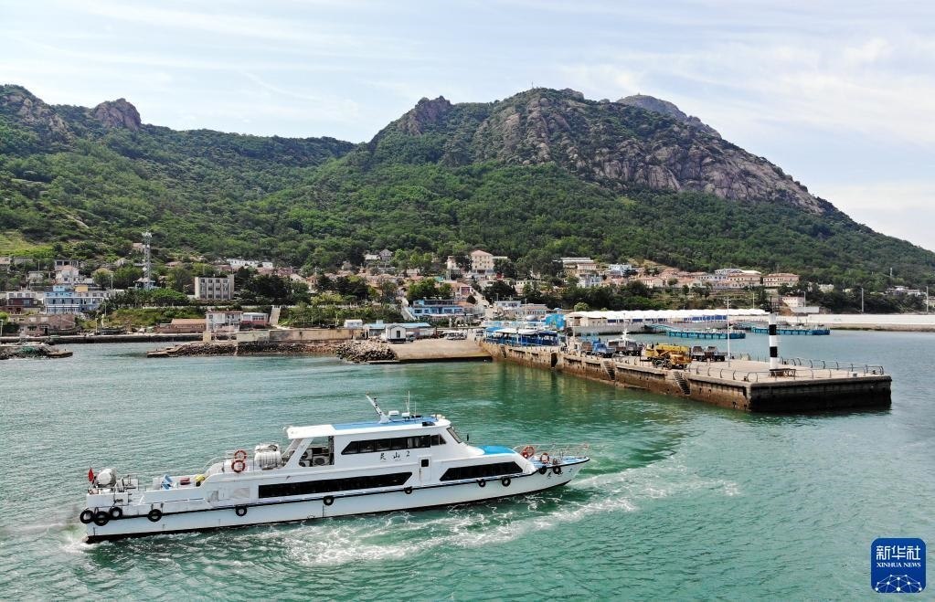 一艘快艇在靈山島省級自然保護區(qū)碼頭接送游客(6月5日攝,無人機照片)。
