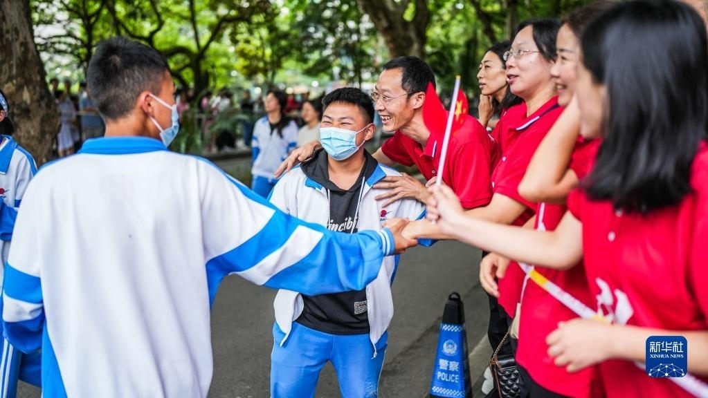 6月7日,在吉林省長春市五十六中學(xué)考點,考生入場前與送考老師擊掌。