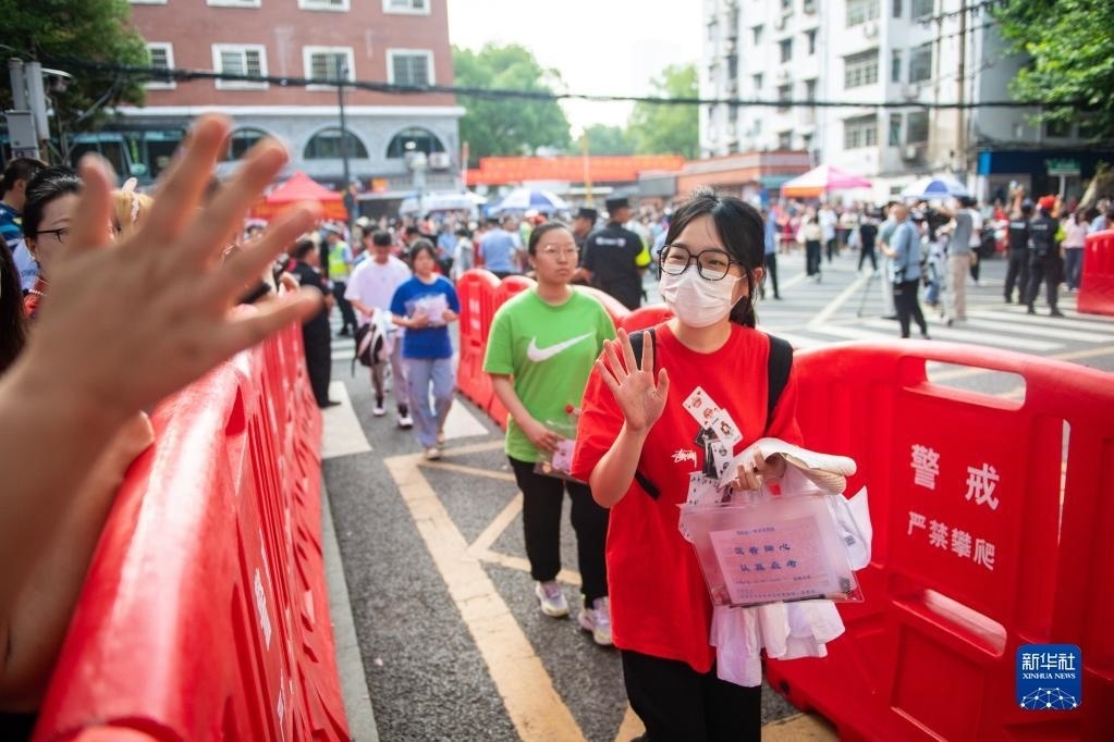 6月7日,在北京師范大學(xué)附屬實驗中學(xué)考點門口,考生走進考點后向家長揮手。