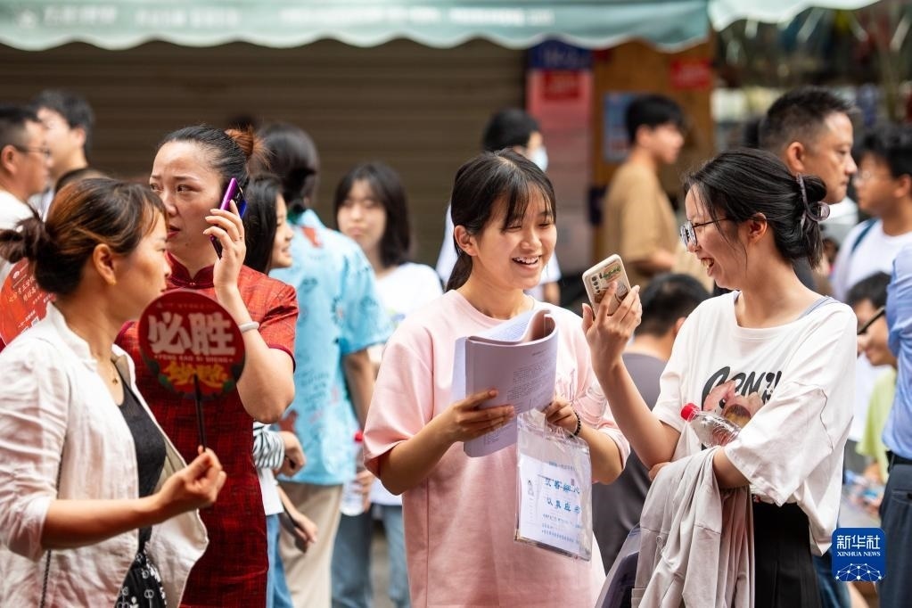 6月7日,在湖南長沙市第一中學(xué)考點,考生在考場外和同學(xué)聊天。