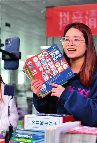 廊坊市永清經(jīng)濟(jì)開(kāi)發(fā)區(qū)京聯(lián)集團(tuán)館配圖書(shū)聯(lián)合現(xiàn)采基地,工作人員在電商平臺(tái)直播銷(xiāo)售圖書(shū)(2023年3月26日攝)。駱學(xué)峰攝/本刊