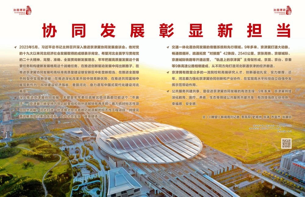 ◇2023年5月,習(xí)近平總書(shū)記主持召開(kāi)深入推進(jìn)京津冀協(xié)同發(fā)展座談會(huì)。他對(duì)黨的十九大以來(lái)河北經(jīng)濟(jì)社會(huì)發(fā)展取得的成績(jī)表示肯定,希望河北全面學(xué)習(xí)貫徹黨的二十大精神,完整、準(zhǔn)確、全面貫徹新發(fā)展理念,牢牢把握高質(zhì)量發(fā)展這個(gè)首要任務(wù)和構(gòu)建新發(fā)展格局這個(gè)戰(zhàn)略任務(wù),在推進(jìn)創(chuàng)新驅(qū)動(dòng)發(fā)展中闖出新路子,在推進(jìn)京津冀協(xié)同發(fā)展和高標(biāo)準(zhǔn)高質(zhì)量建設(shè)雄安新區(qū)中彰顯新?lián)?dāng),在推進(jìn)全面綠色轉(zhuǎn)型中實(shí)現(xiàn)新突破,在推進(jìn)深化改革開(kāi)放中培育新優(yōu)勢(shì),在推進(jìn)共同富裕中展現(xiàn)新作為,加快建設(shè)經(jīng)濟(jì)強(qiáng)省、美麗河北,奮力譜寫(xiě)中國(guó)式現(xiàn)代化建設(shè)河北篇章。