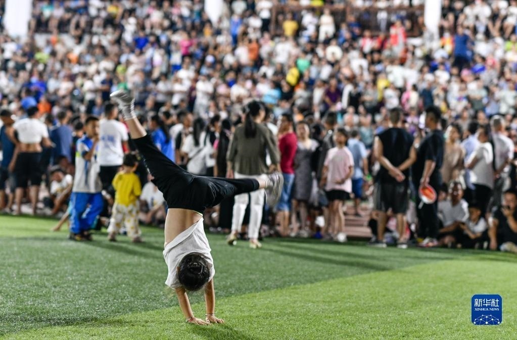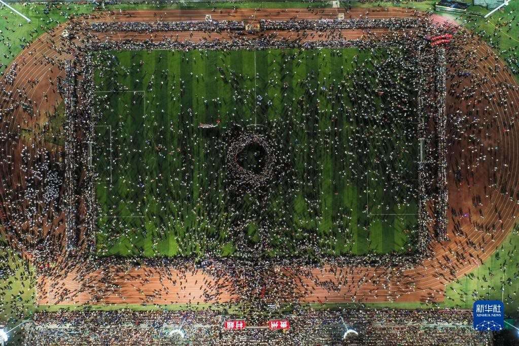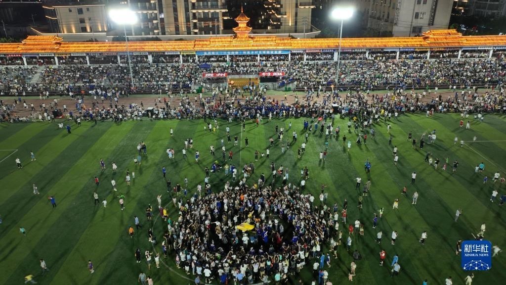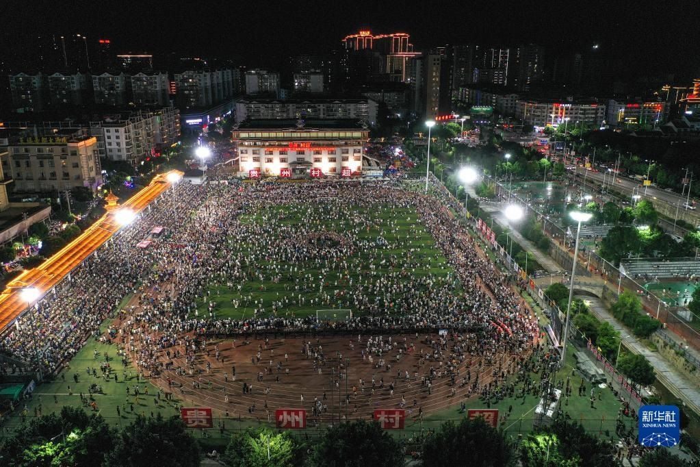 6月10日,演員在貴州“村超”足球比賽后表演民族舞蹈“多耶”,現(xiàn)場觀眾一起上場狂歡(無人機照片)。