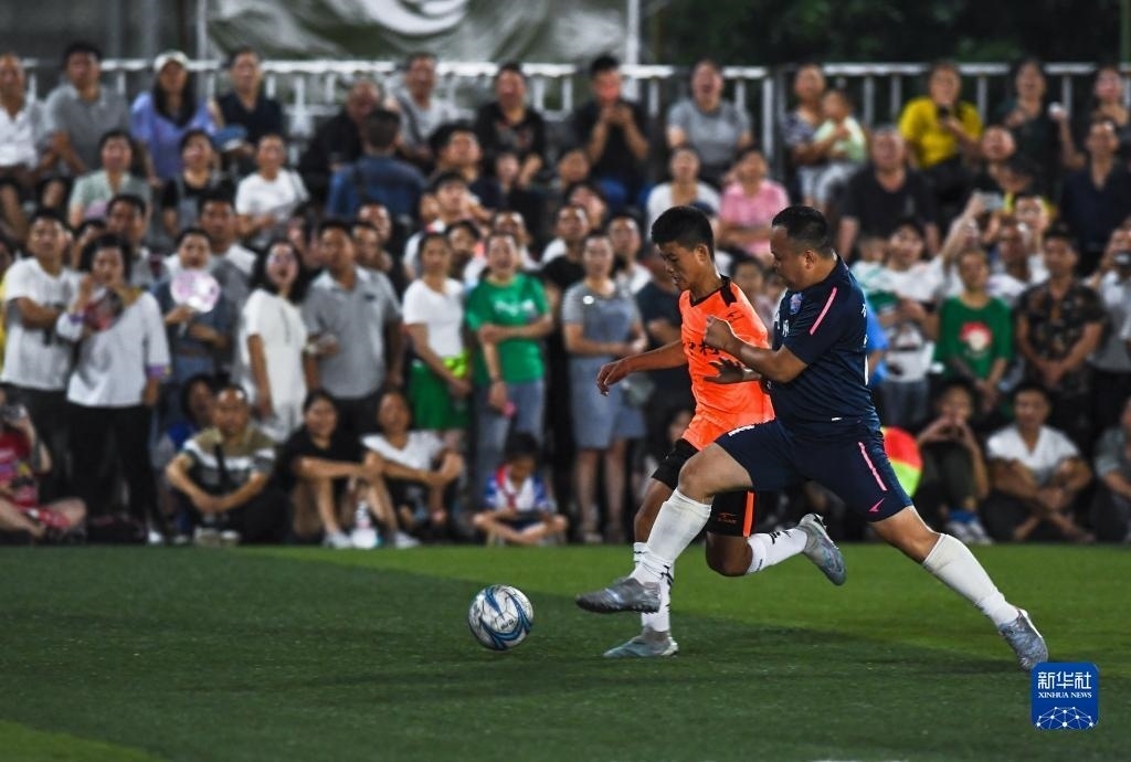 6月9日,新中村足球隊球員(左)與鳳凰村足球隊球員在比賽中拼搶。