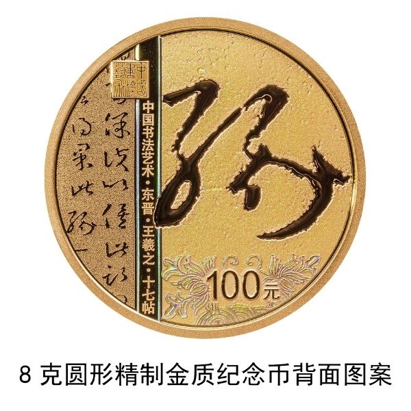 8克圓形金質(zhì)紀(jì)念幣背面圖案為東晉王羲之書(shū)《十七帖》局部文字及“緣”字樣與裝飾紋樣、“中國(guó)書(shū)法藝術(shù)”篆刻鈐印等組合設(shè)計(jì),并刊“中國(guó)書(shū)法藝術(shù)·東晉·王羲之·十七帖”字樣及面額。