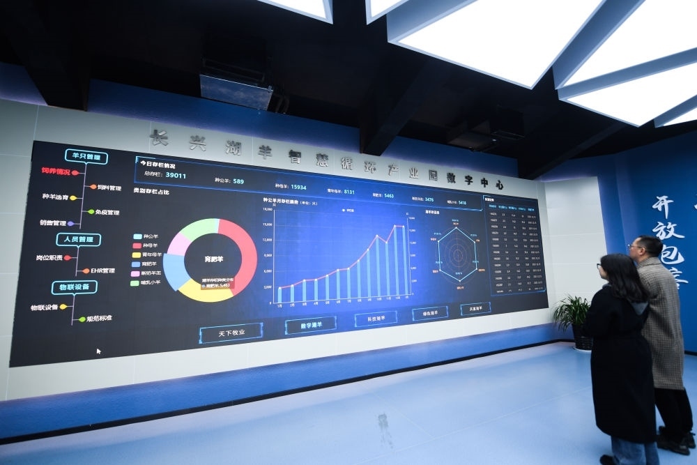 浙江省湖州市長興縣呂山鄉(xiāng)湖羊智慧循環(huán)產(chǎn)業(yè)園里的數(shù)字大屏實時顯示湖羊的各類監(jiān)控數(shù)據(jù)(2022年1月6日攝)。新華社記者 徐昱 攝