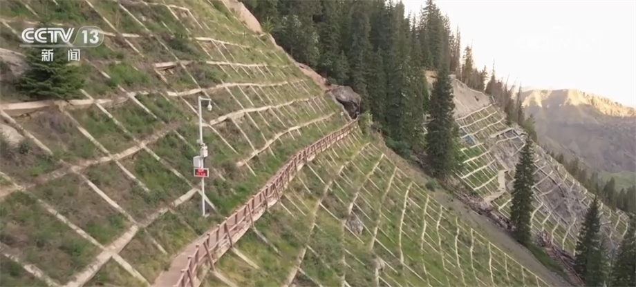 天池的水來自于天山深處的冰川融水,由南向北形成多條瀑布、河流,一路向山下奔流,成為當(dāng)?shù)刂匾霓r(nóng)業(yè)灌溉水源,滋養(yǎng)著下游80多萬畝土地。我們現(xiàn)在看到這些鋪在山野中的網(wǎng)格,就是當(dāng)?shù)卣谶M(jìn)行的生態(tài)修復(fù)與地質(zhì)災(zāi)害防治工程,人們?cè)谶@些網(wǎng)格間播撒草籽,來穩(wěn)定區(qū)域生態(tài)環(huán)境,有效防范地質(zhì)災(zāi)害的發(fā)生。
