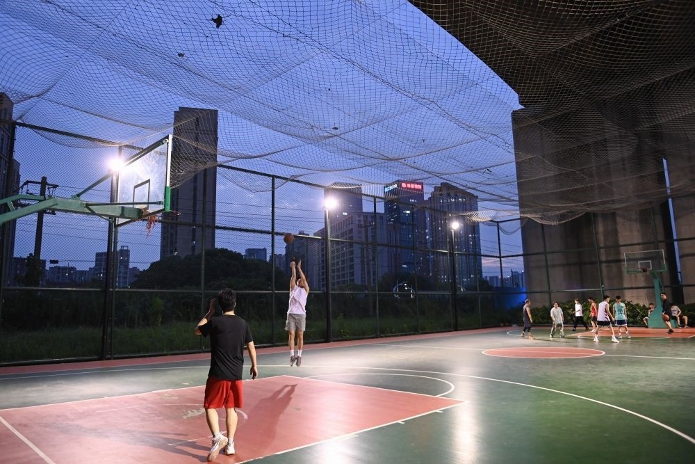 2022年9月20日,市民在位于高鐵橋下的錢江世紀(jì)城體育公園打籃球。在杭州,一批運(yùn)動場館見縫插針地“嵌入”市民生活圈,城市空間的“邊角余料”正成為全民健身的“金角銀邊”。新華社記者 黃宗治 攝