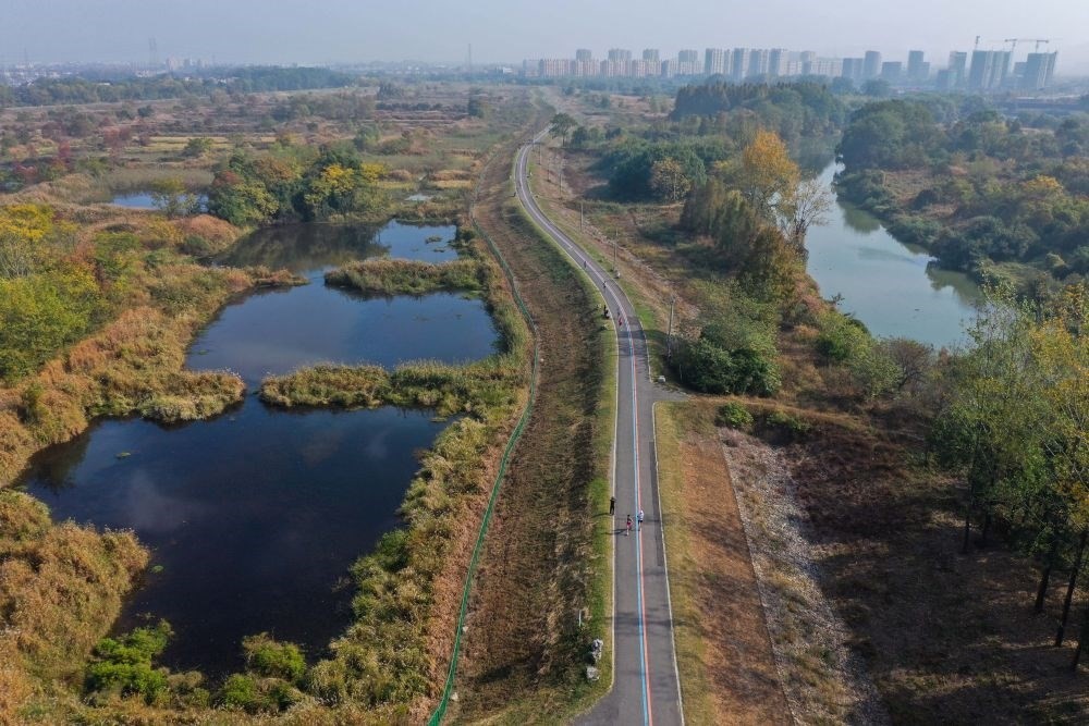 2022年11月12日,運(yùn)動愛好者們在浙江省杭州市余杭區(qū)瓶窯鎮(zhèn)北湖草蕩生態(tài)濕地的健身游步道上參加健康跑比賽(無人機(jī)照片)。新華社記者 徐昱 攝