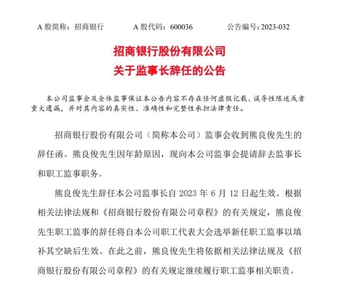 同在13日,招商銀行發(fā)布公告,該行監(jiān)事長(zhǎng)熊良俊因年齡原因辭任。招商銀行表示,熊良俊自2021年8月起擔(dān)任招商銀行監(jiān)事長(zhǎng)。