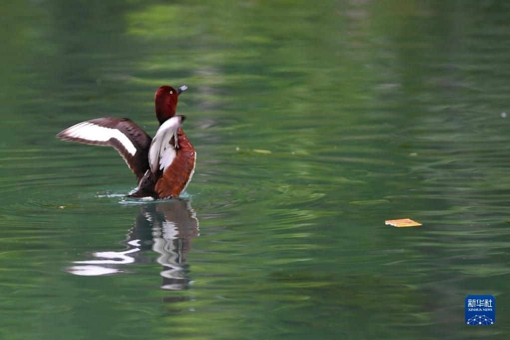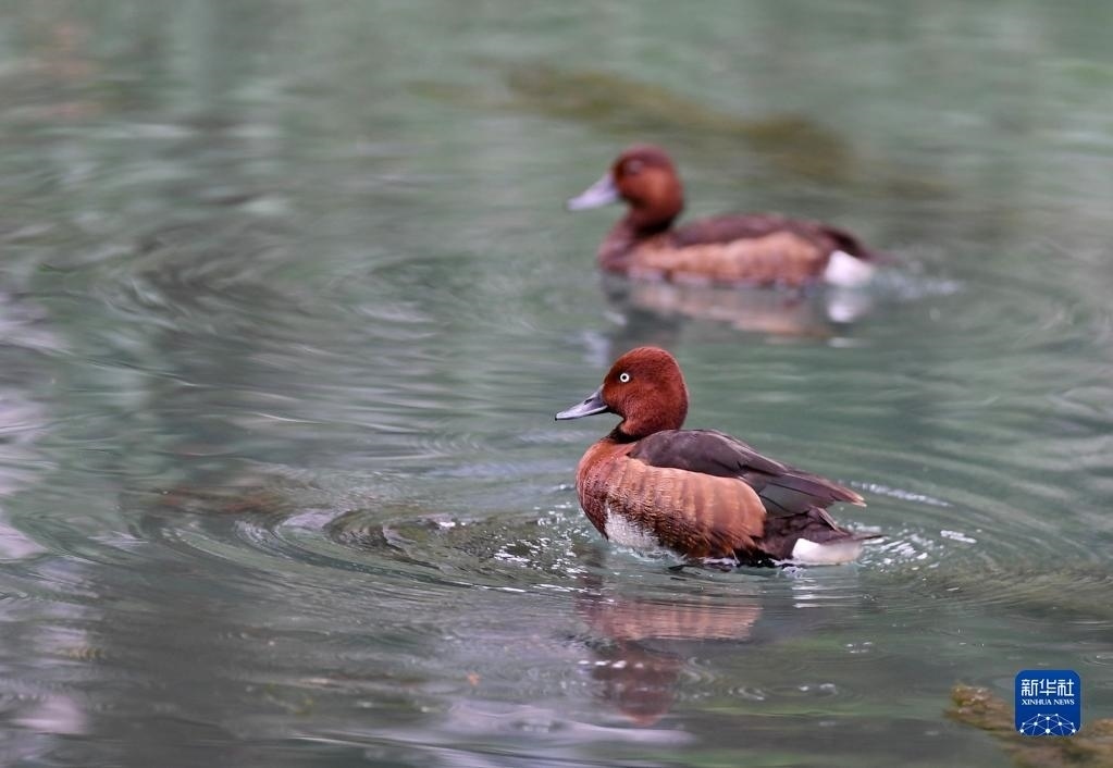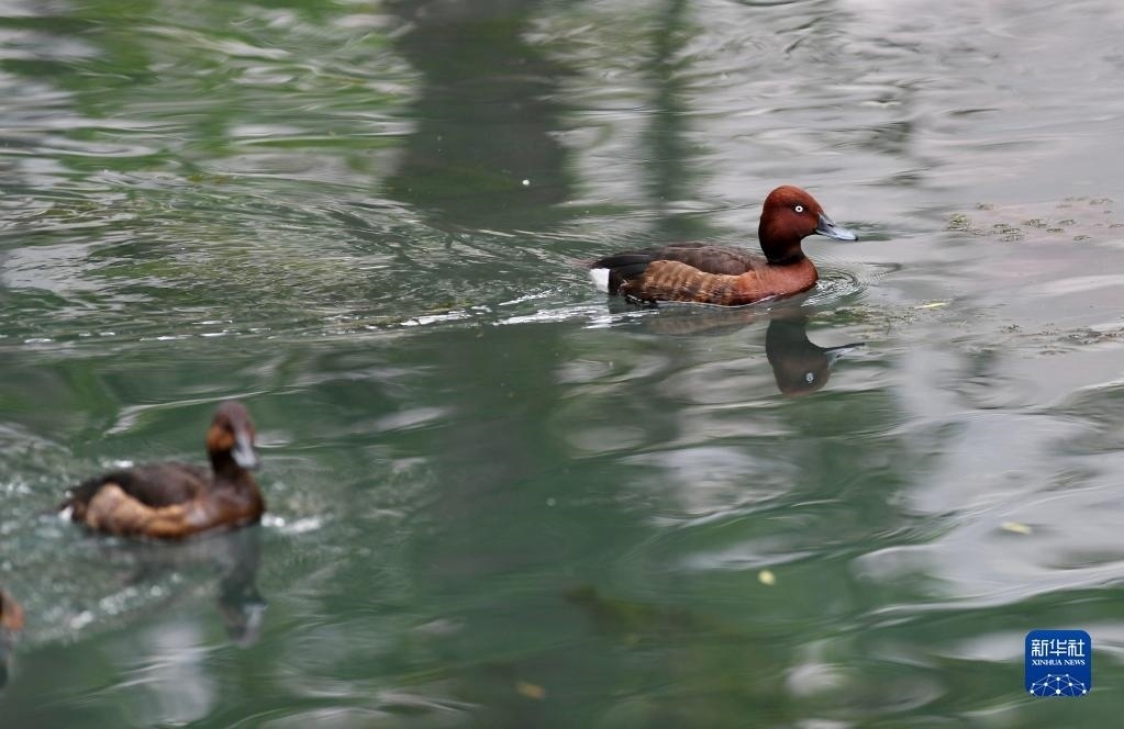 夏日里,白眼潛鴨和鳳頭潛鴨在西藏拉薩市拉魯濕地國家級(jí)自然保護(hù)區(qū)中干渠里覓食、嬉戲。新華社記者 張汝鋒 攝