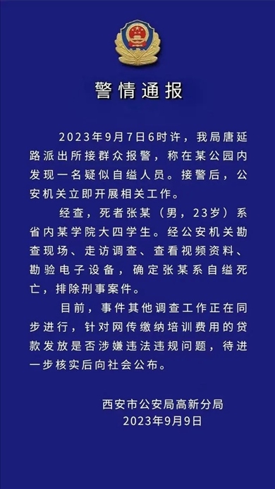 ·西安高新警方通報(bào)“大四學(xué)生自縊身亡”:排除刑案,正進(jìn)一步核實(shí)網(wǎng)傳貸款問(wèn)題。