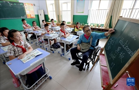 今年48歲的楊季剛是山東省棗莊市永安鎮(zhèn)遺棠小學(xué)一名鄉(xiāng)村教師,從教已28年。2017年初,楊季剛因意外摔成重傷,終生將與輪椅為伴??恐B強(qiáng)的毅力,歷經(jīng)康復(fù)訓(xùn)練的艱辛,2018年秋季楊季剛?cè)缙诨氐搅诵@,在特制1米高的小黑板上頑強(qiáng)地續(xù)寫(xiě)他的教師生涯。